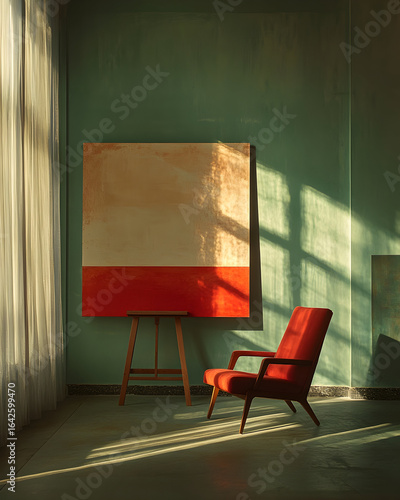 Cozy interior with red chair and abstract painting
