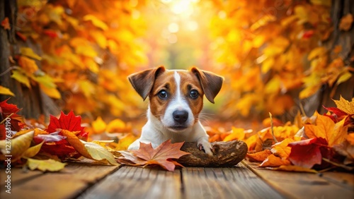 Cozy Jack Russell puppy snuggled up in autumn leaves, surrounded by vibrant orange and yellow foliage on a wooden alleyway , woodland scene, leaves