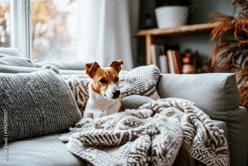 cozy jack russell terrier relaxing on a comfy couch surrounded by warm knitted blankets in a stylish living room