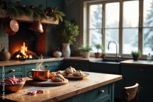 Cozy kitchen scene with warm fire, steaming beverage, and freshly baked cookies on a wooden island