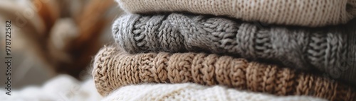Cozy knit sweaters stacked together, highlighting textures and warmth for winter fashion and comfortable living.