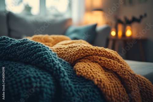Cozy Knitted Blankets: Teal & Mustard Knit Throws on Couch, Warm Home Interior with Pillows and Candle Light