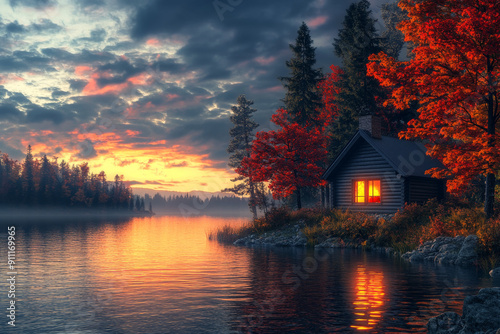 Cozy Lakeside Cabin Amid Vibrant Autumn Foliage