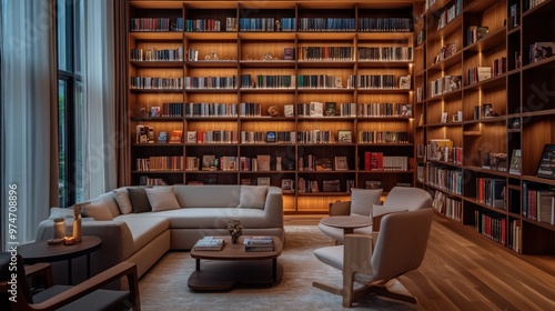 Cozy library space with bookshelves, seating, and warm lighting for relaxation and reading.