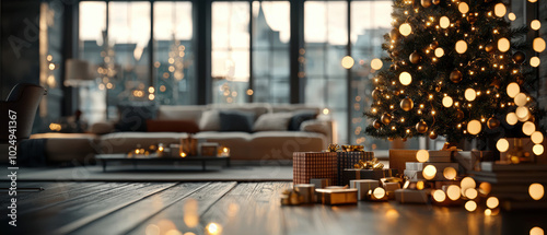 Cozy living room adorned with Christmas tree and festive decorations, warm atmosphere.