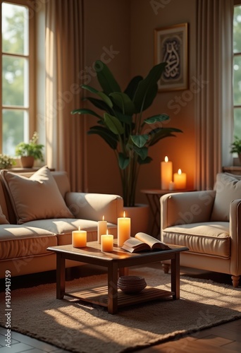 cozy living room ambiance prayer candles ambient lighting relaxation serenity, fireplace, sofa, reading, decor, atmosphere, flame, glass, blanket, table, wood