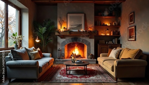 Cozy living room interior with fireplace, comfortable sofa, and warm lighting, creating a relaxing atmosphere Perfect for autumn or winter settings , interior, wood