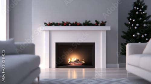 Cozy living room scene featuring a modern fireplace, decorated mantel, and a Christmas tree, creating a warm and inviting holiday atmosphere.