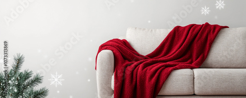 Cozy living room scene with a red blanket draped on a white sofa during winter.