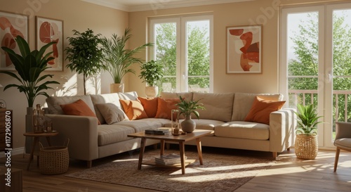 Cozy living room, warm sunlight, large windows, lush green plants, beige sofa, orange accent pillows, wooden coffee table, neutral color palette, framed artwork, natural textures, jute rug, bohemian d