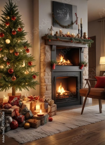Cozy living room with a fireplace and Christmas decorations, mantel, firelight, candles