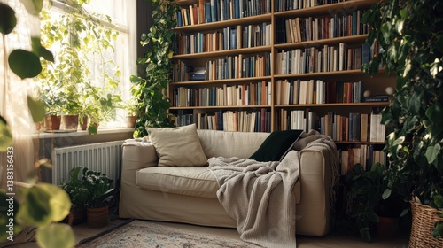 Cozy living room with bookshelves, plants, and sofa