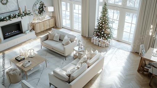 Cozy living room with Christmas decorations, white colors, and large windows.