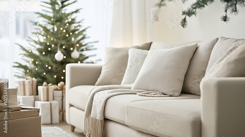 Cozy Living Room with Christmas Tree and Decorations