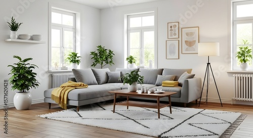 Cozy Living Room with Gray Sectional Sofa, Plants, and Natural Light from Windows Interior