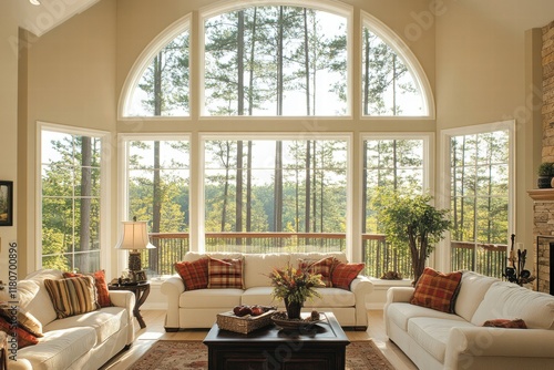 Cozy Living Room with Large Windows Overlooking Scenic forest