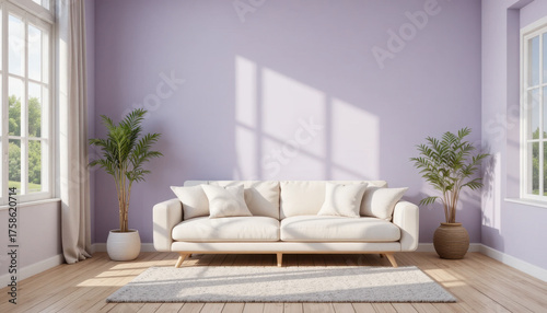 Cozy living room with white sofa and cushions is set against light purple wall, flanked by two potted plants. Sunlight streams through large windows, creating serene atmosphere