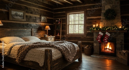 Cozy Log Cabin Bedroom with Fireplace and Christmas Stockings