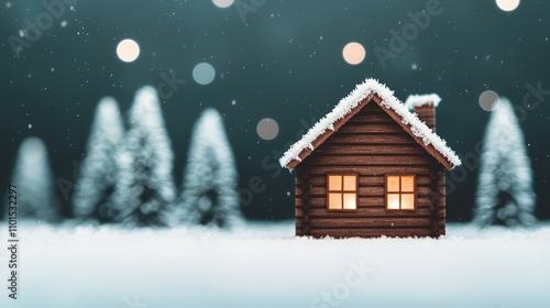Cozy Log Cabin in Snowy Winter Landscape with Soft Bokeh Lights and Frosted Trees in the Background