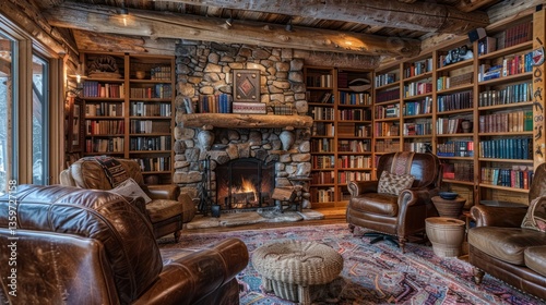 Cozy log cabin library with fireplace (1)