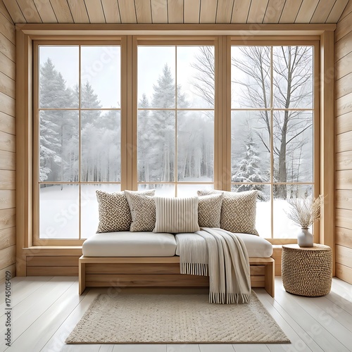 Cozy minimalist scandinavian living spa with large winter windows and wood accents