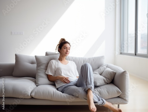 Cozy modern apartment with a young woman lounging on a gray sofa in a casual outfit