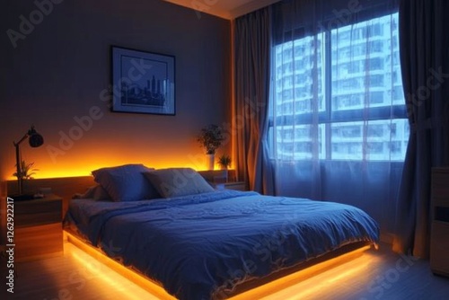 Cozy modern bedroom with ambient lighting in a stylish urban apartment at night