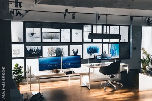 Cozy, Modern home office workplace with computer and desk, wooden floor, natural light, and rug with a big window view of the city