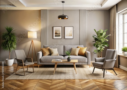 Cozy modern living room interior with sleek grey sofa, cream-colored armchair, and gleaming hardwood floor, ideal for virtual meeting or video conferencing backgrounds.