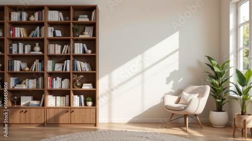 Cozy modern living room with wooden bookshelf, comfortable chair, natural light, and indoor plants