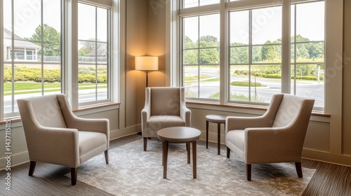Cozy modern lounge with soft armchairs and natural light in a welcoming interior space