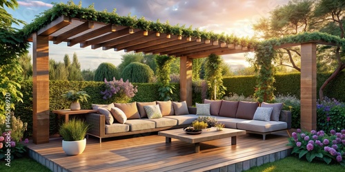 Cozy modern patio with sectional sofa under a lush pergola surrounded by greenery and flowers in a serene outdoor setting , sectional sofa, garden