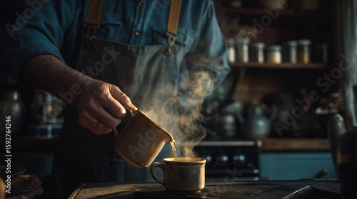 Cozy Morning Man Pouring Steaming Coffee into Rustic Mug in Vintage Kitchen Setting
