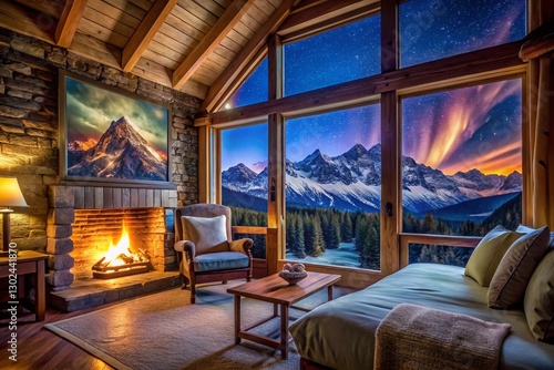 Cozy Mountain Cabin Bedroom with Fireplace & Stunning View - Night Photography Stock Photo