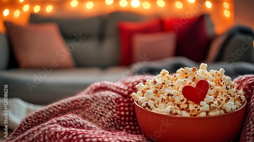 Cozy movie night scene with popcorn in a bowl on a knitted blanket in front of a sofa with warm lighting.
