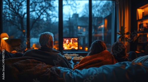 Cozy movie night with family in a warmly lit living room.
