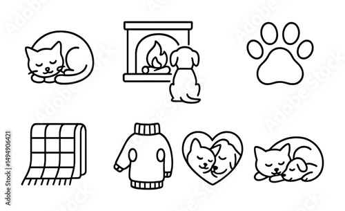 Cozy pet outline icons set – furry friends, warmth, and snuggly illustrations