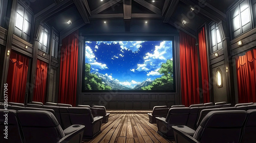 Cozy private cinema interior with plush seating and large screen displaying vibrant scenic landscape under blue sky and white clouds