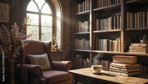 Cozy Reading Nook: A tranquil and inviting library corner, with a comfortable armchair, bookshelves, and a sunlit window, creating a sense of peace and serenity.