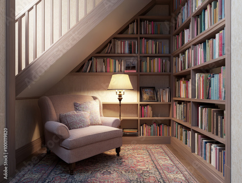 Cozy Reading Nook Under Staircase with Warm Illumination