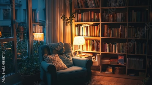 Cozy Reading Nook with Bookshelf and Soft Lighting in Evening Glow