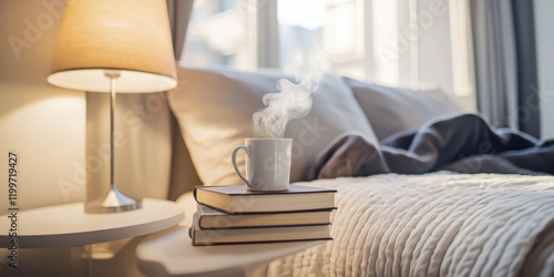 cozy reading nook with steaming cup, soft blankets, and warm light