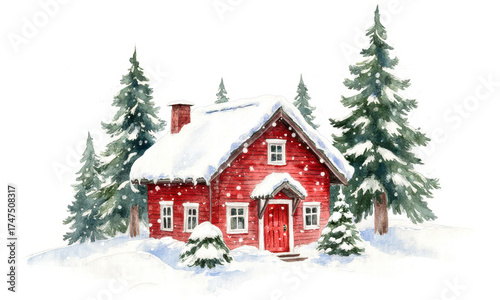 Cozy Red Cabin in Snowy Pine Forest