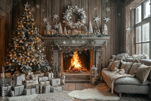 Cozy rustic Christmas setting with fireplace, gray sofa with silver stars, Christmas tree with star ornaments, and scattered gifts under the tree. Warm holiday ambiance.