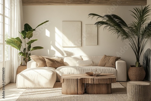 Cozy Scandinavian Living Room with Exposed Wood and Large Plants in Soft Lighting - Side Angle Shot with Natural and Bright Ambiance