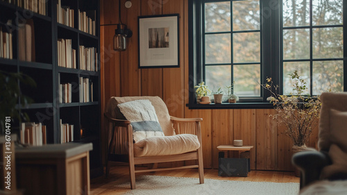 cozy Scandinavian style room with wooden paneling and comfy chair