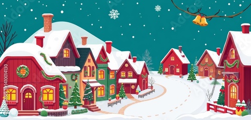 Cozy Scandinavian-style Christmas village houses, whimsical festive decor, snow, bells, flat vector illustration, christmas scene, winter graphic