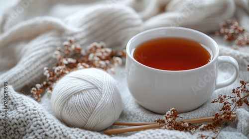 Cozy scene featuring a cup of tea beside a ball of yarn and knitting needles on a soft blanket