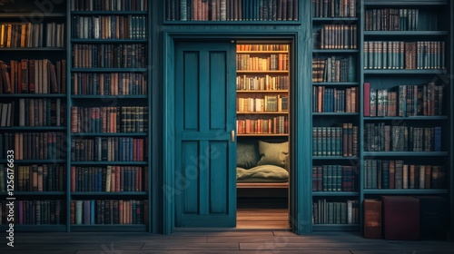 Cozy Small Bookstore with Slightly Open Door Revealing Warm Light and Shelves Filled with Colorful Books
