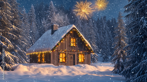 Cozy snow-covered cabin in a winter forest, decorated with Christmas lights. Fireworks light up the sky, creating a festive holiday scene, perfect for Christmas and New Year themes.